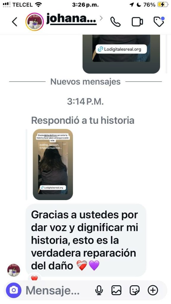 The emotional impact was devastating: panic attacks, isolation, suicidal thoughts, and relentless social pressure (from acquaintances and strangers alike) that singled her out. Even so, Johana found strength in her support network and learned that true love does not violate—and that digital gender-based violence is an aggression that is relived every time someone mentions or shares the incident.